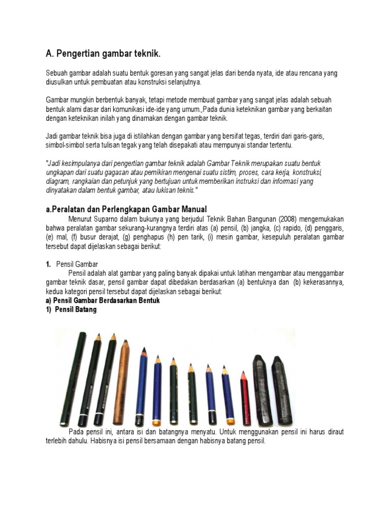 Pensil adalah alat gambar yang paling banyak dipakai untuk latihan mengambar atau menggambar gambar teknik dasar. Luasnya 1 m 2 dan perbandingan panjang dan lebar 1. Pena yang digunakan untuk mengambar pada kertas gambar bisa dipergunakan dengan teknik tangan bebas free hand maupun gambar kiat yang menggunakan penggaris.